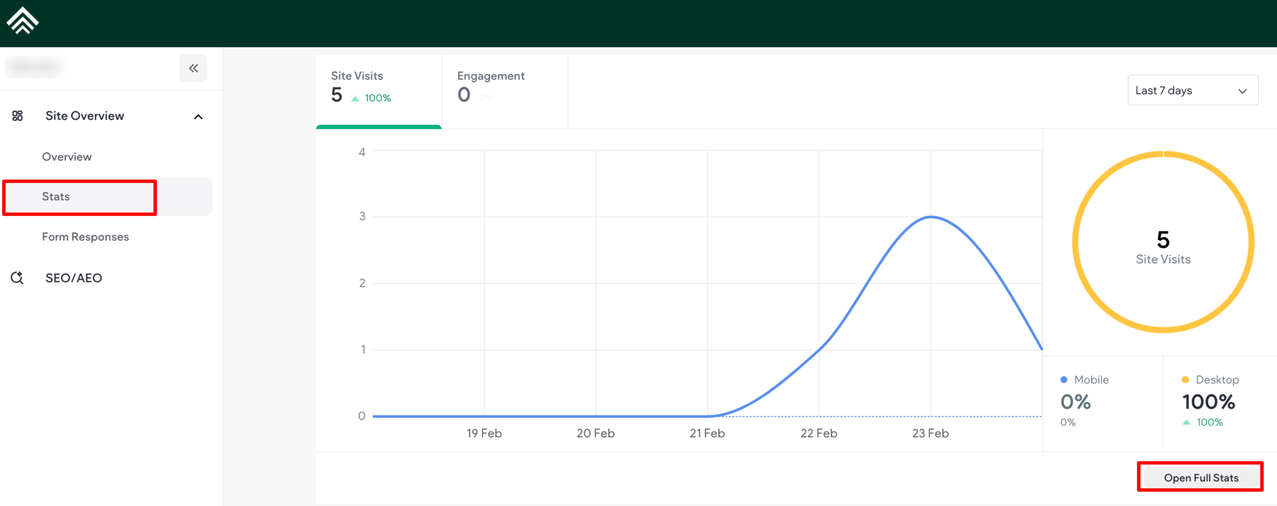 We record and display full statistics for your site, per device, so you can view exactly what users are doing on desktop, tablet, and mobile. If you are not seeing any statistics, likely a user has not yet visited the site (it takes 24 hours for stats to update). If you are using a mobile-only site, ensure the redirect is installed and is redirecting users to the correct site.