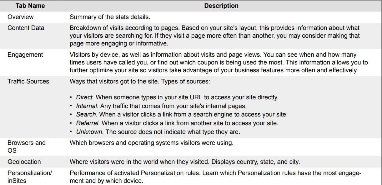 Site stats show detailed analytics about how many visitors your site gets, where they are coming from, and which pages they have visited. Analyzing this customer information can help you make more informed decisions to improve your site and your business.
