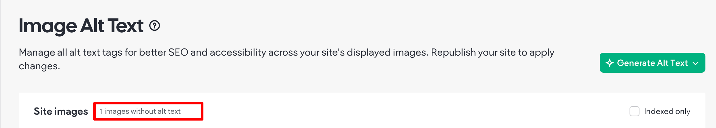 - The sum of images missing the alt text, is near the “Site images” title, as shown below: