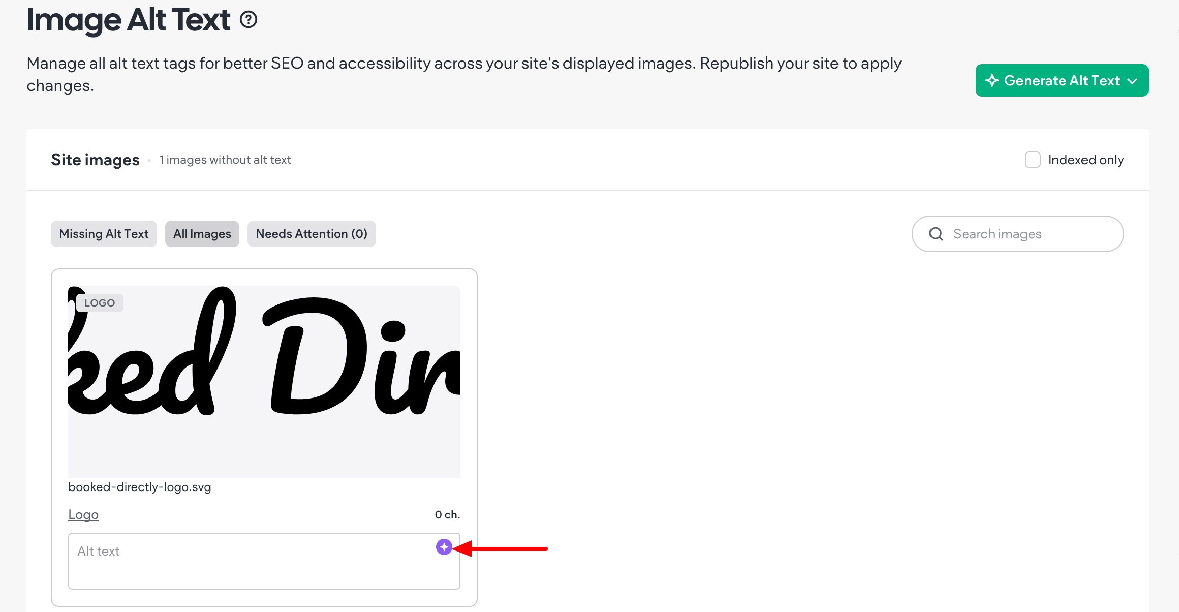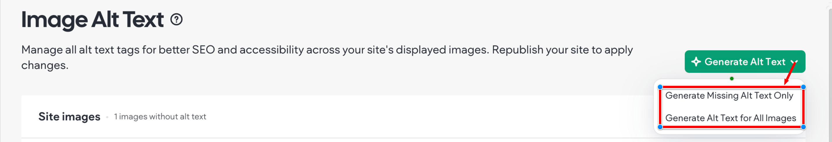 If you are adding alt text in bulk, click Generate Alt Text and select one of two alt text generation options: generate alt text for all site images or generate alt text for site images missing alt text.