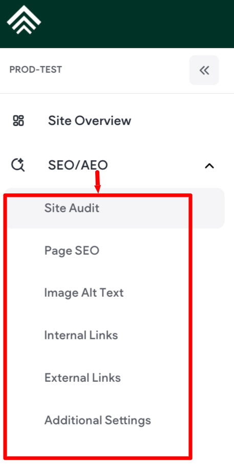 The SEO/AEO tab contains Site Audit, Page SEO, Image ALT Text, and Additional Settings