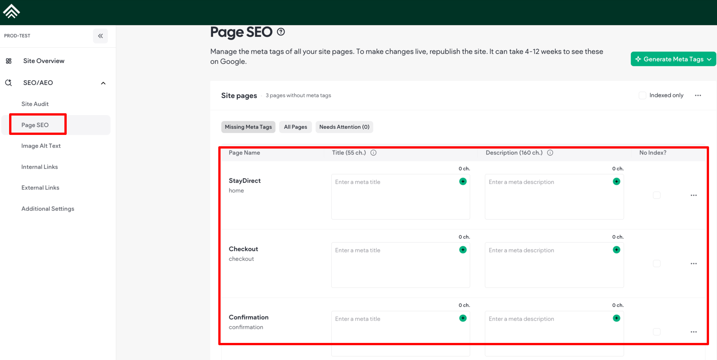Add and manage the meta title and description tags of all your site pages in one place. To make your changes live, republish your site when you're ready. To edit a tag for a page, click into the desired field.
