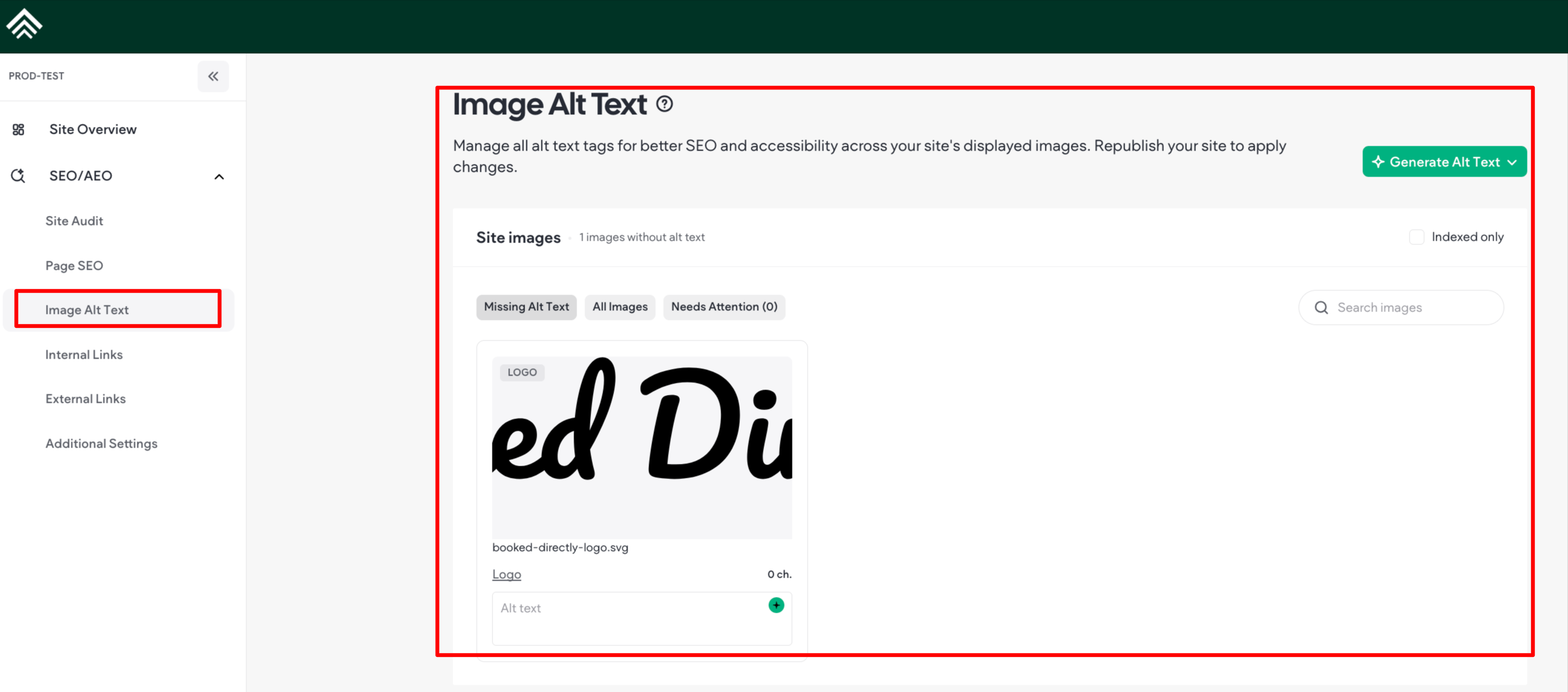 - In the side panel of the Site Dashboard, click SEO and then click Image Alt Text.