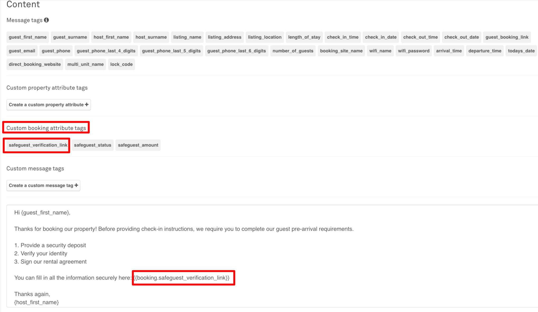 When Safeguest is enabled, the Safeguest verification link is not sent automatically. To send the verification link to guests, you’ll need to include it in your preferred Uplisting automated messages.