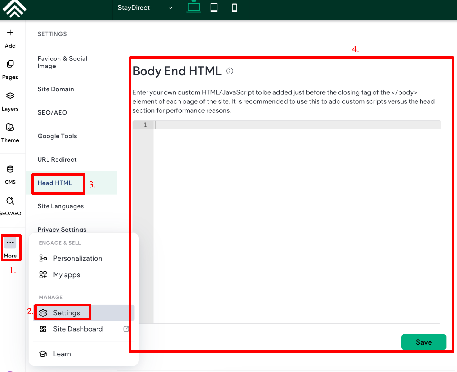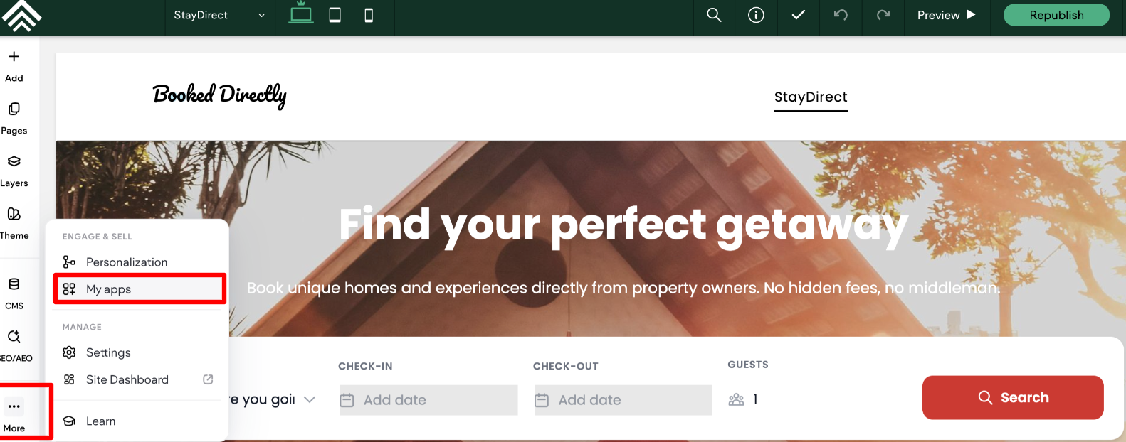 - In the site editor's left panel, click More → My Apps . This will open the app marketplace.