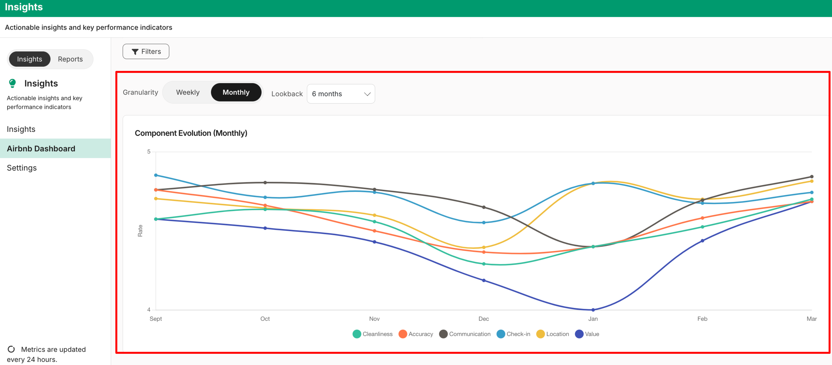 You can monitor the following key metrics measured, e.g., cleanliness, accuracy, communication, check-in, location and value: