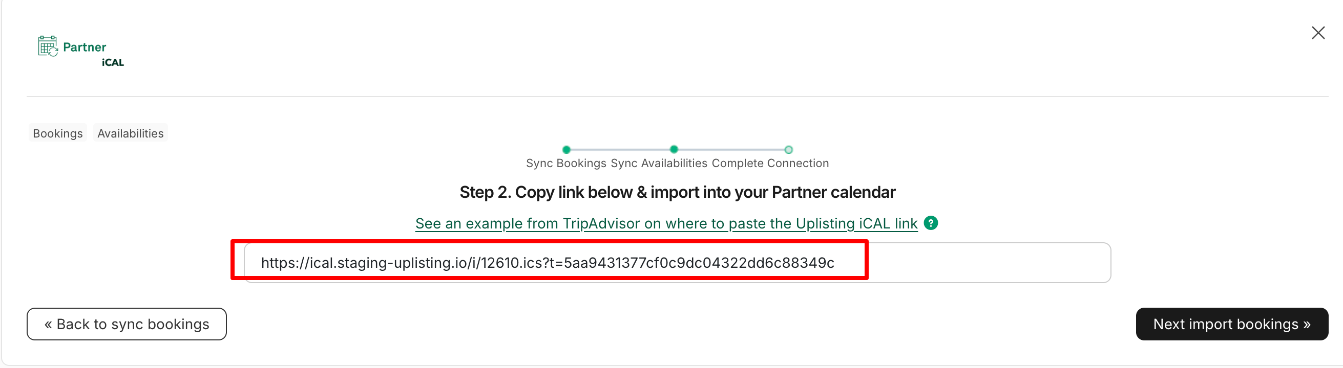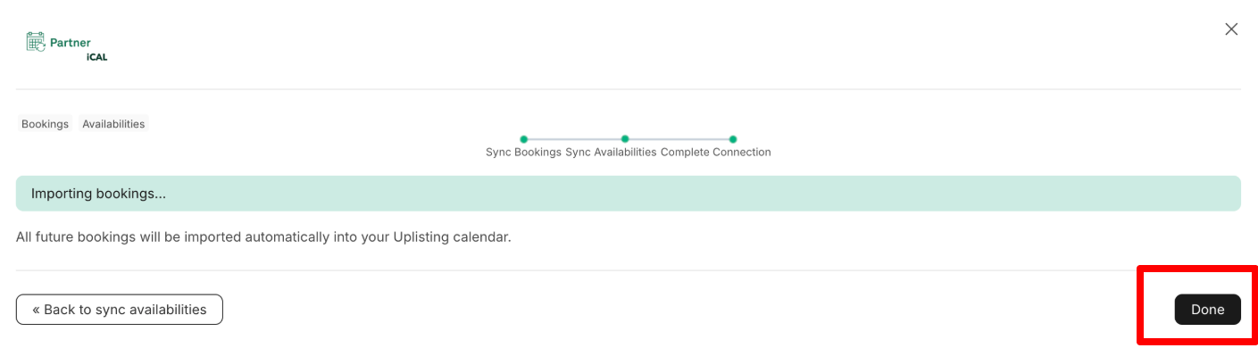 - Once done, return to Uplisting and click the 'Next: Import Bookings' button in** step 6 above**. This starts syncing bookings and availabilities.