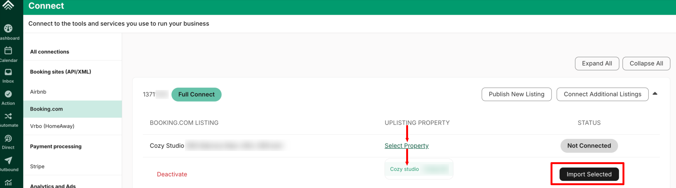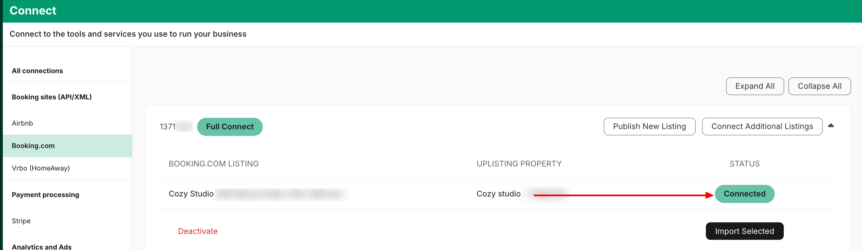 - Your Booking.com account will appear as fully connected, and the active Booking.com properties will be imported into Uplisting.