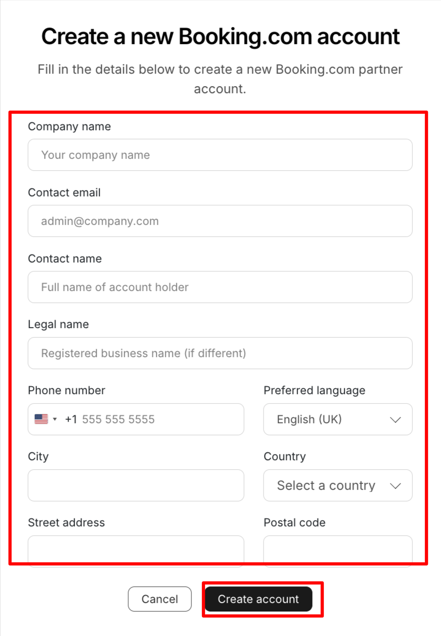 - Legal contact name and legal contact email — Booking.com will send the contract and all onboarding communication to this email