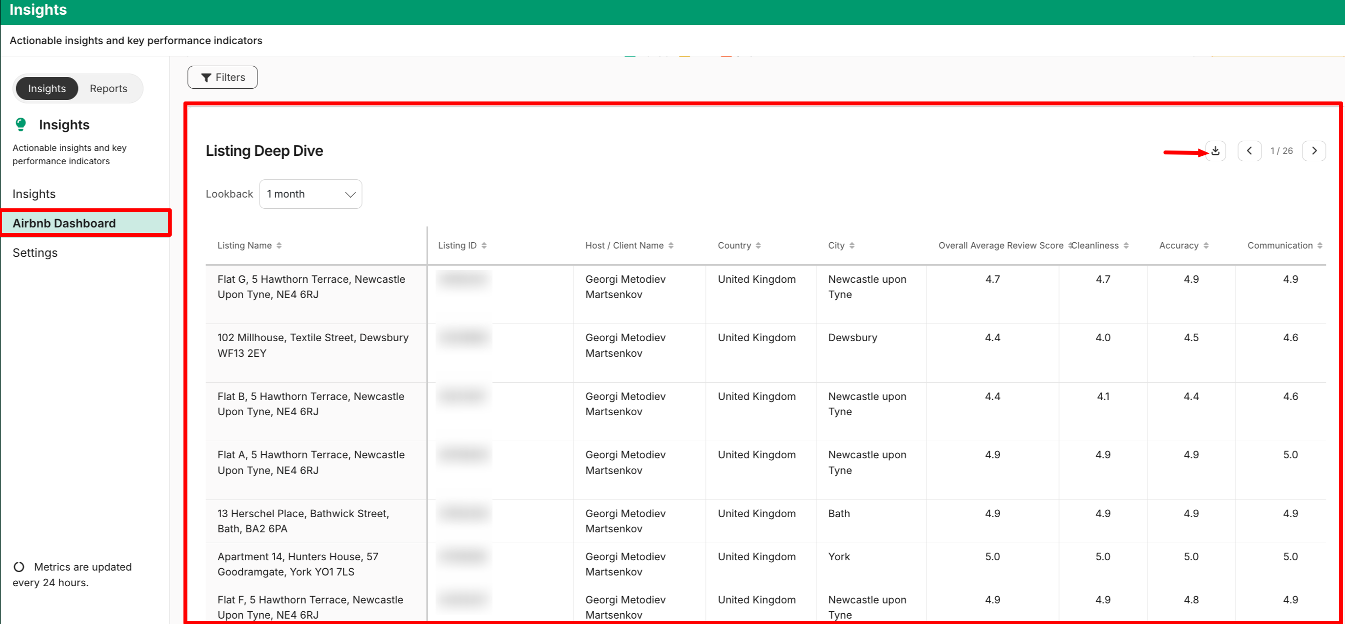 The Listing Deep Dive table provides a detailed view of performance across all your listings within the selected lookback period. This can be downloaded by selecting the download icon shown at the top right corner.
