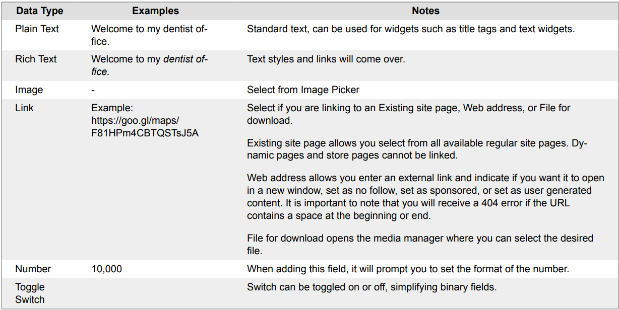 • Currently supported fields: plain text, rich text, location, links, and images (with links only, images in the CSV won’t be uploaded).