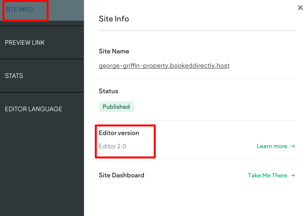 Option 2: Navigate to the top navigation bar and click the Info & Tools tab. Within the Site Info section, locate the Editor Version label. Editor 2.0 sites are labeled Editor 2.0, while Classic are labeled Classic.