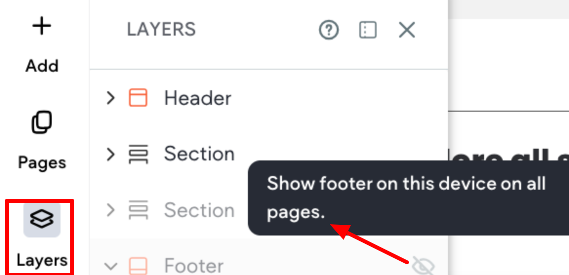 To unhide the footer from the layers panel, click the crossed out eye icon next to the footer. Note that unhiding the footer from the layers panel only unhides it from the pages and devices you selected to have it hidden on.