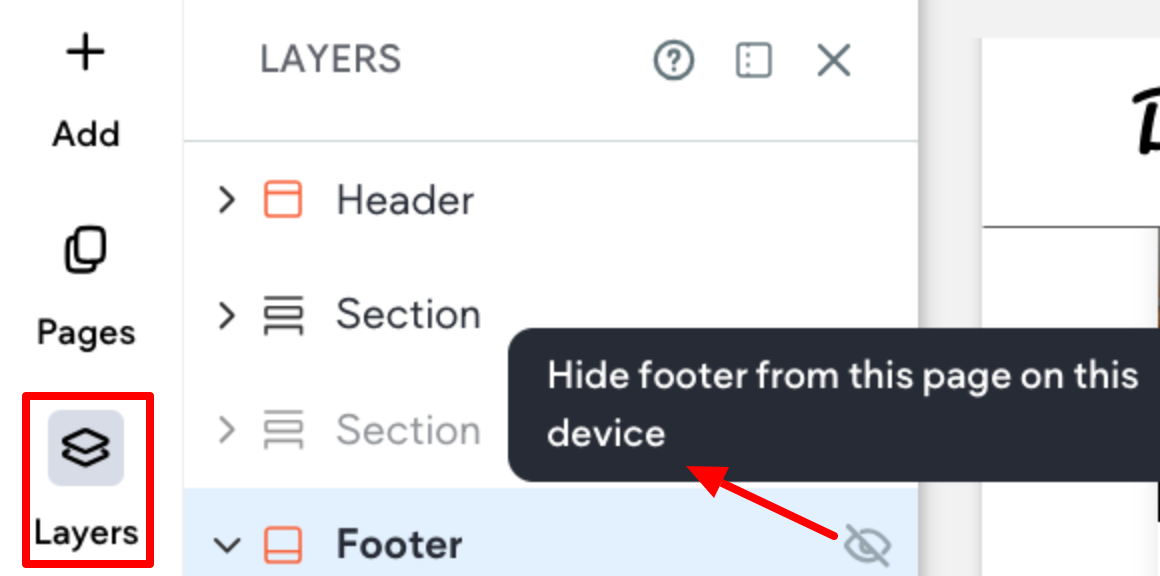 When hiding the footer from the layers panel, it hides the footer for the current page and device. To hide the footer from the layers panel, click the eye icon next to the footer layer.