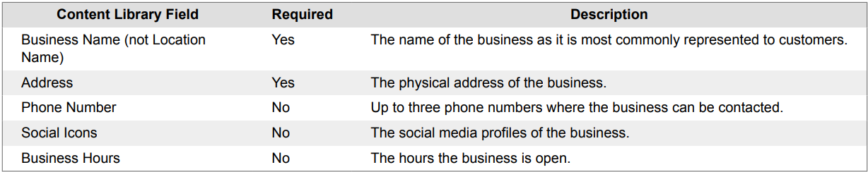 Google has very specific restrictions in terms of what information is necessary in order to sync to Google Business Profile as well as the formatting of this information. Please keep these limitations in mind when updating business data in the site’s Content Library when syncing to Google Business Profile. If you do not follow the requirements set by Google you will run into errors in syncing the data.