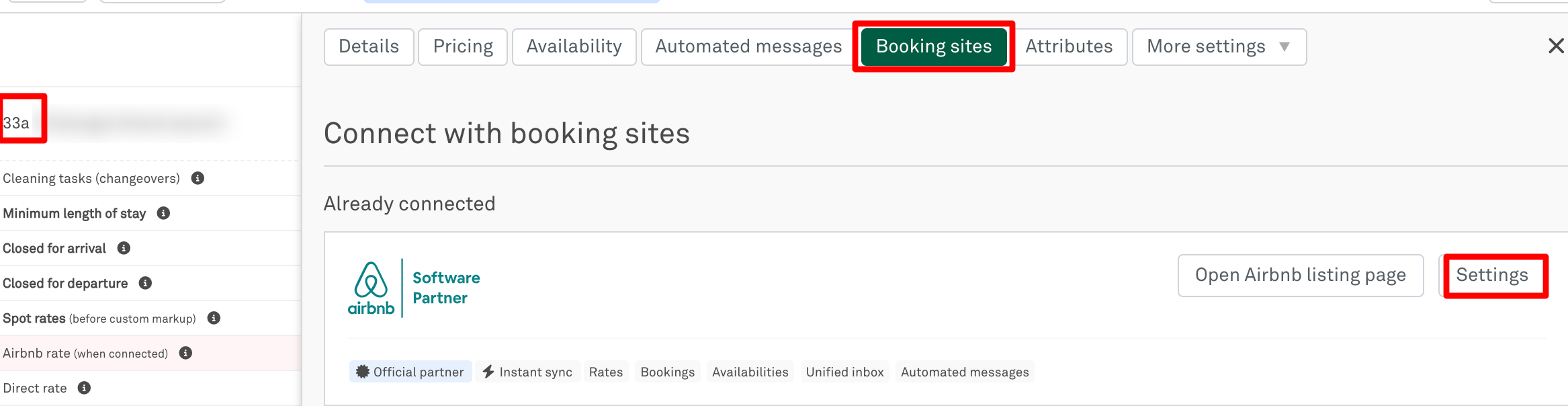 Click on the Booking Sites tab, and locate the Airbnb option, then select the Settings button