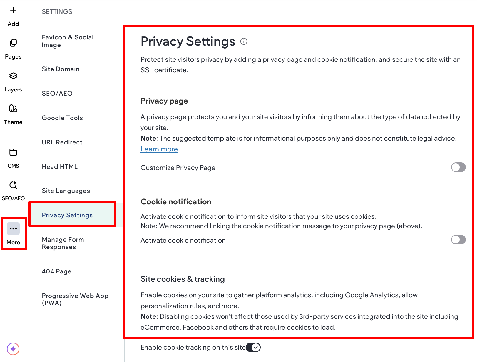 - Make the necessary changes and when you republish the site, the privacy page will be added or updated.