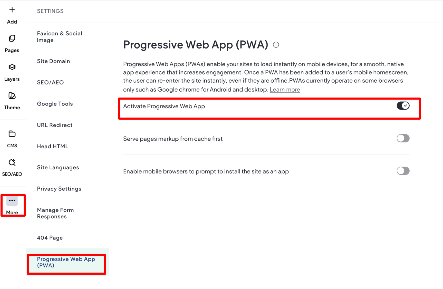 - Click the Activate Progressive Web App toggle.