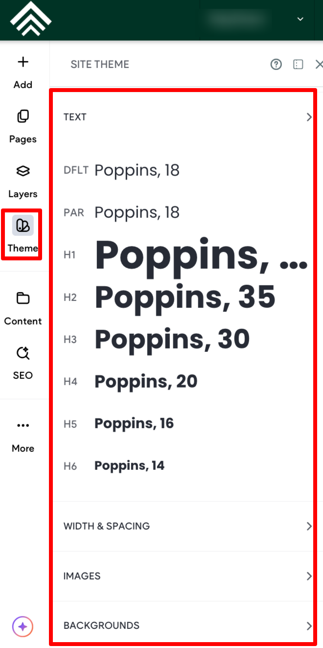To open the Site Theme panel, in the side panel, click Theme. When the Site Theme panel is open, the canvas is automatically minimized to 50% view so that the entire canvas is visible while adjusting the site theme settings. If you want to return to 100% canvas view, click the drop down in the top bar and select 100%. The ability to zoom in or out is also available in preview mode.