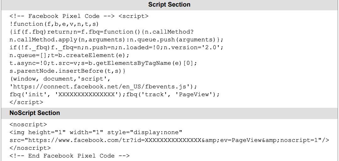 - Note that all of the above code is just an example - do not copy this directly into your site. Please be sure to obtain the correct code from Facebook Pixel Code.