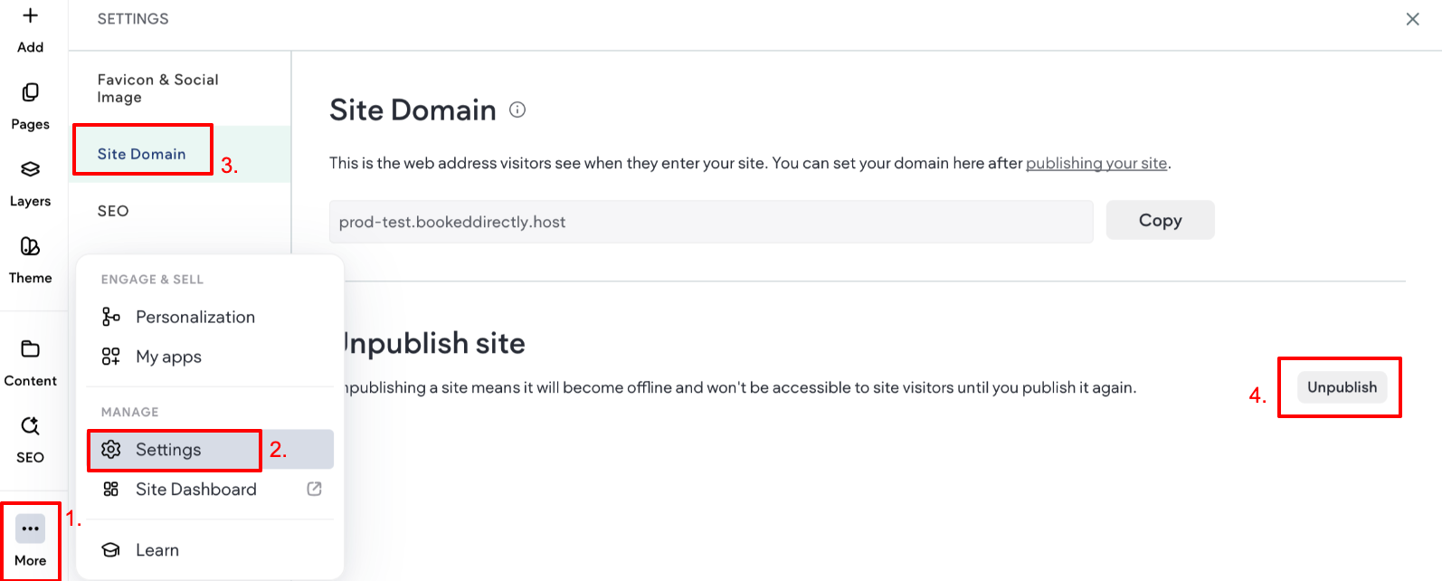 - Locate the Unpublish Site section, and click Unpublish to unpublish your site.