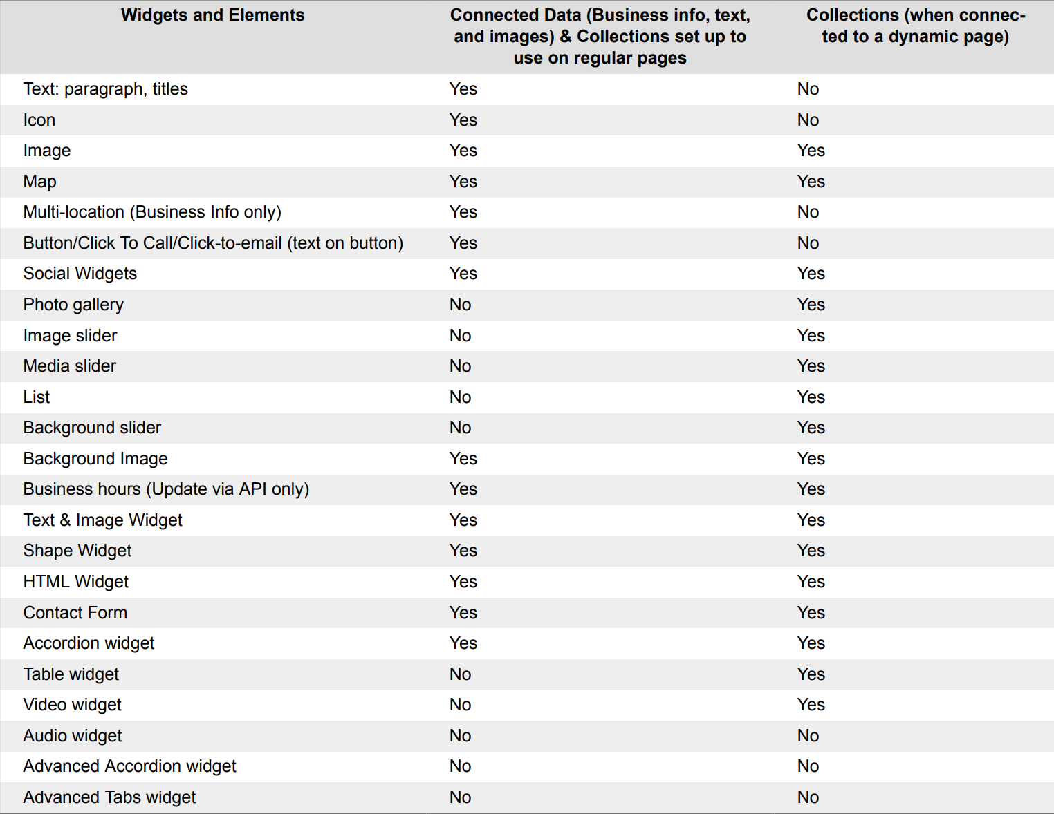 Collections (Internal, Google Sheets, Airtable, and External): Collections are similar to databases in that they contain lists of items that have the same type of information (name, location, image, and so on). The typical use for collections is to generate multiple pages from a dynamic page, some examples may be real estate listings, team pages, and more. Collections can be store internally, or externally. See Dynamic Content: Collections. However, if you may need to manage static content that requires occasional updates and want more flexibility than the Business Info area provides, you can also use collections on regular pages