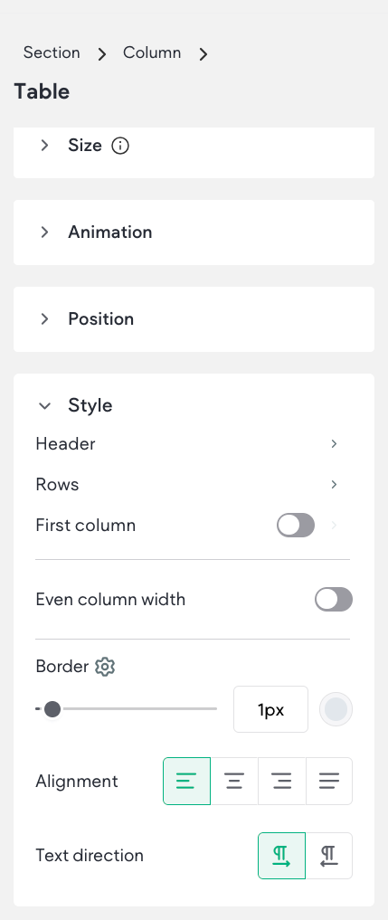 With the design editor you can customize the table border, title bar, background color, and text style for the header, rows, and first column.