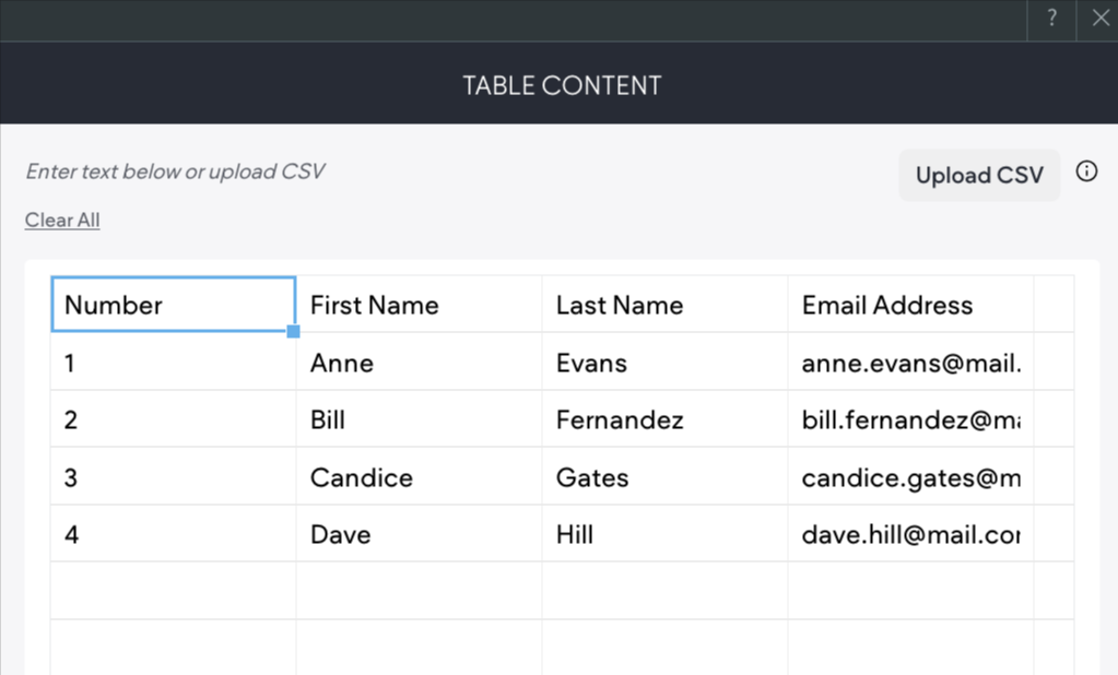 The Table widget allows you to display text data in a table layout with rows and columns. Content can be added to the table by copying and pasting an existing table, using the editor, or uploading a CSV. For information on adding widgets, see Add Widgets